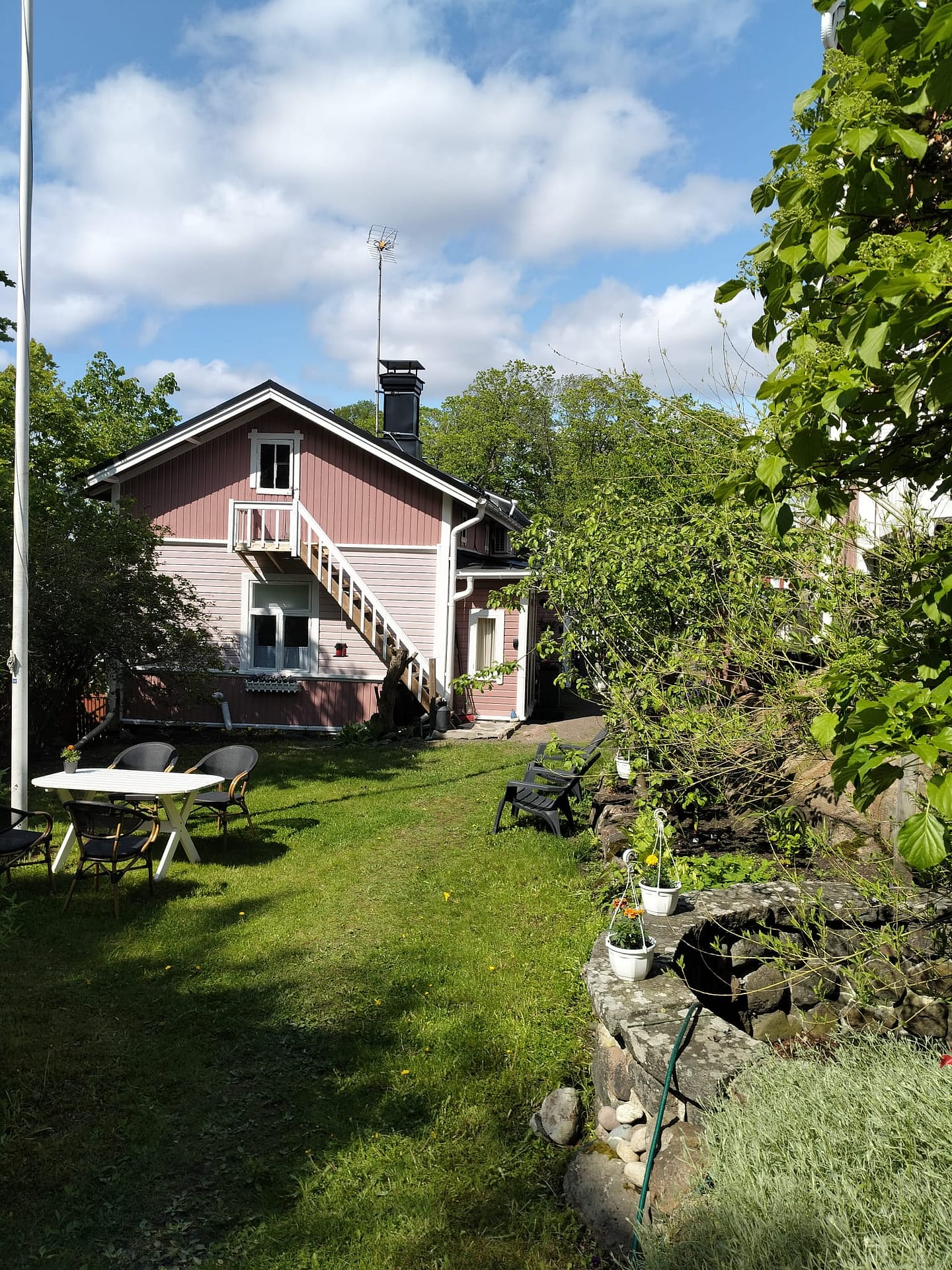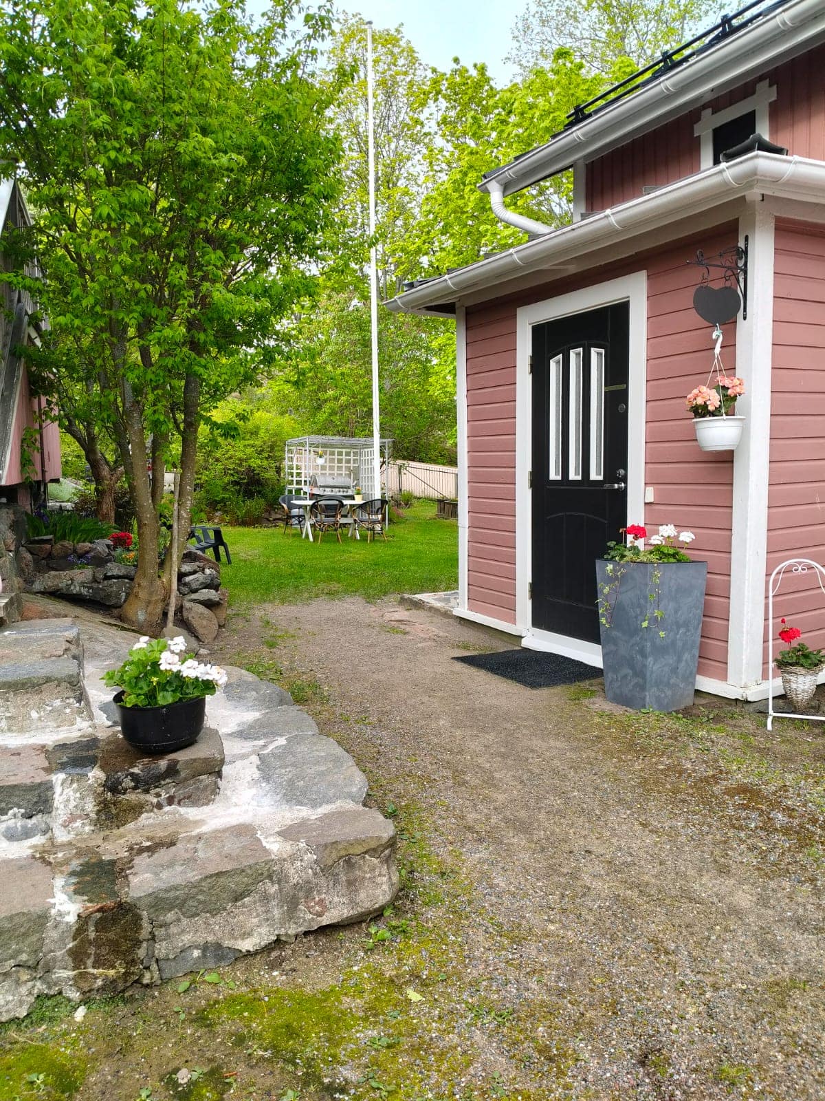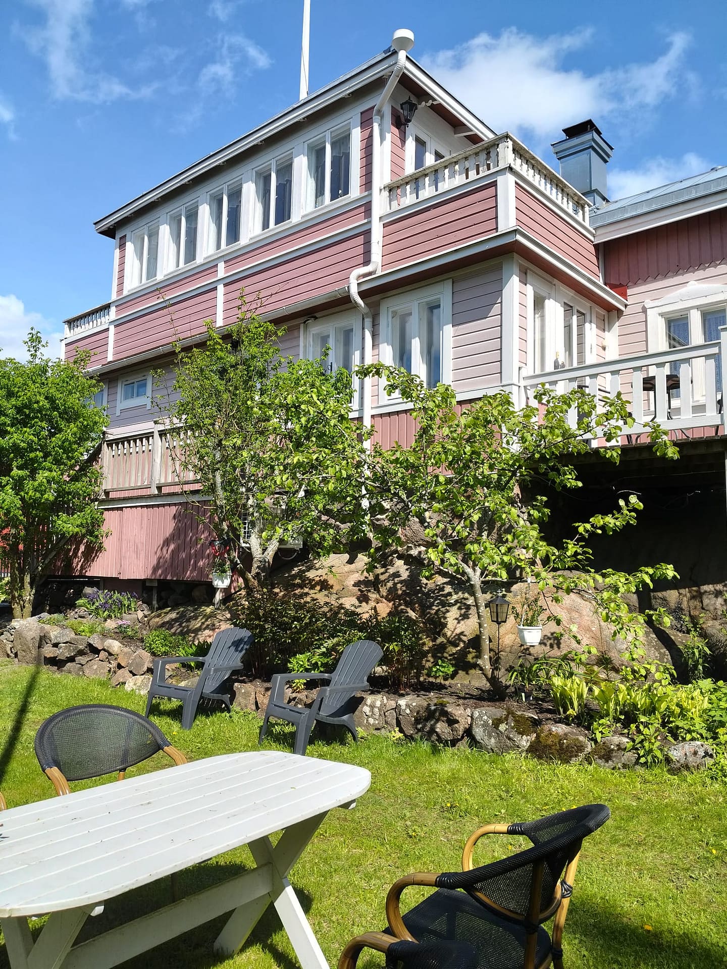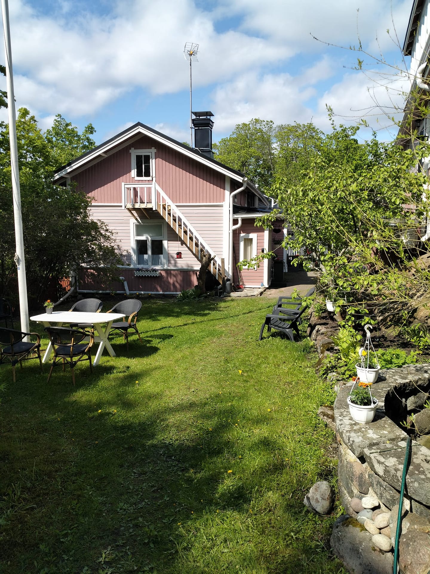 Rauhallinen, iso pihapiiri vanhoine istutuksineen ja kivetyksineen. Useita pöytäryhmiä. Voit istuskella pihalla lintujen laulua kuunnellen tai vaikka grillata ja nauttia Naantalin auringosta. Parkkipaikka löytyy.