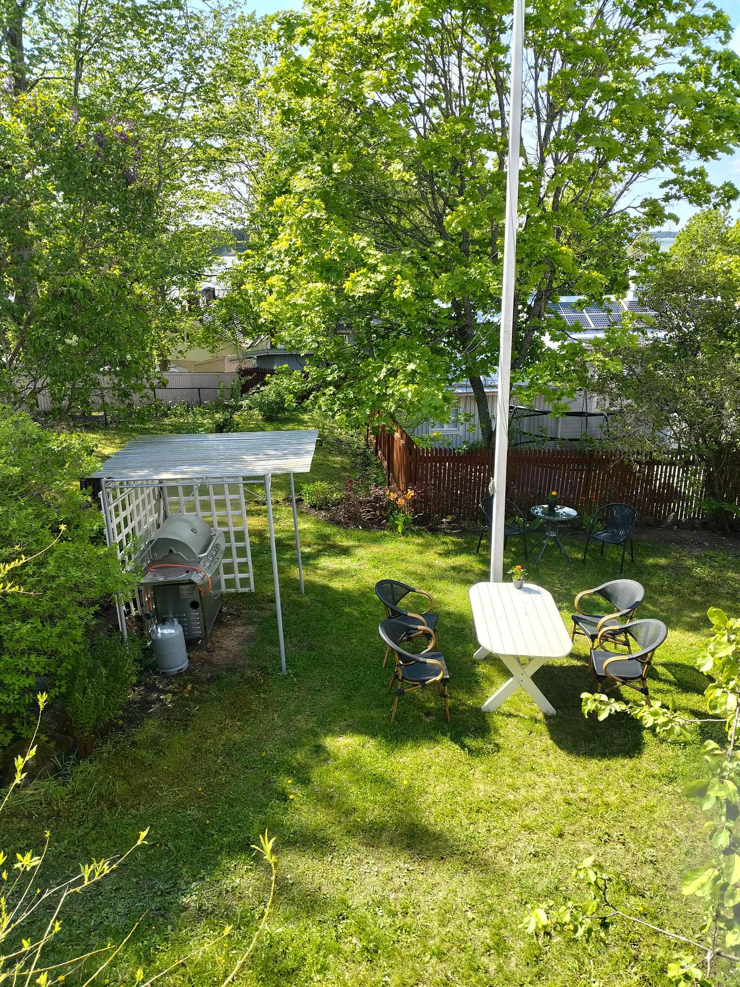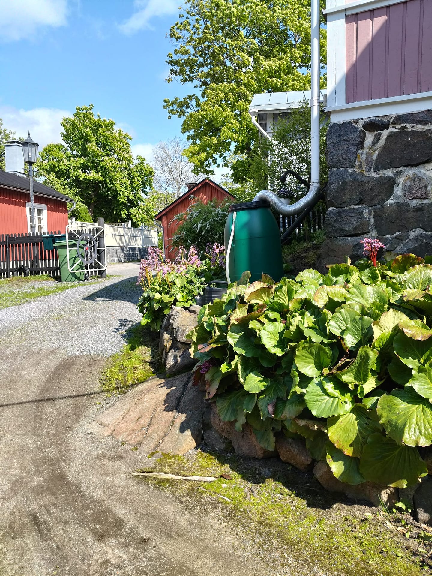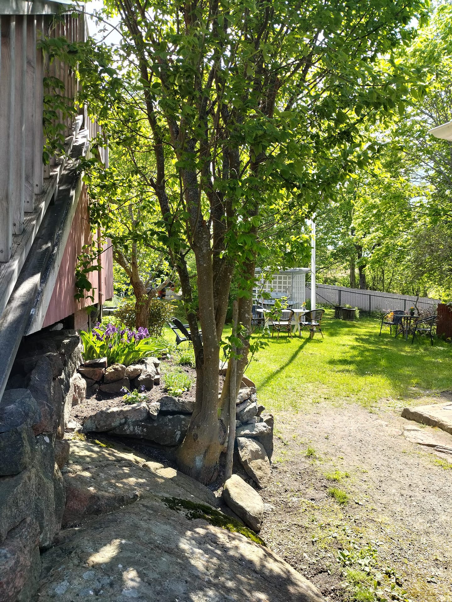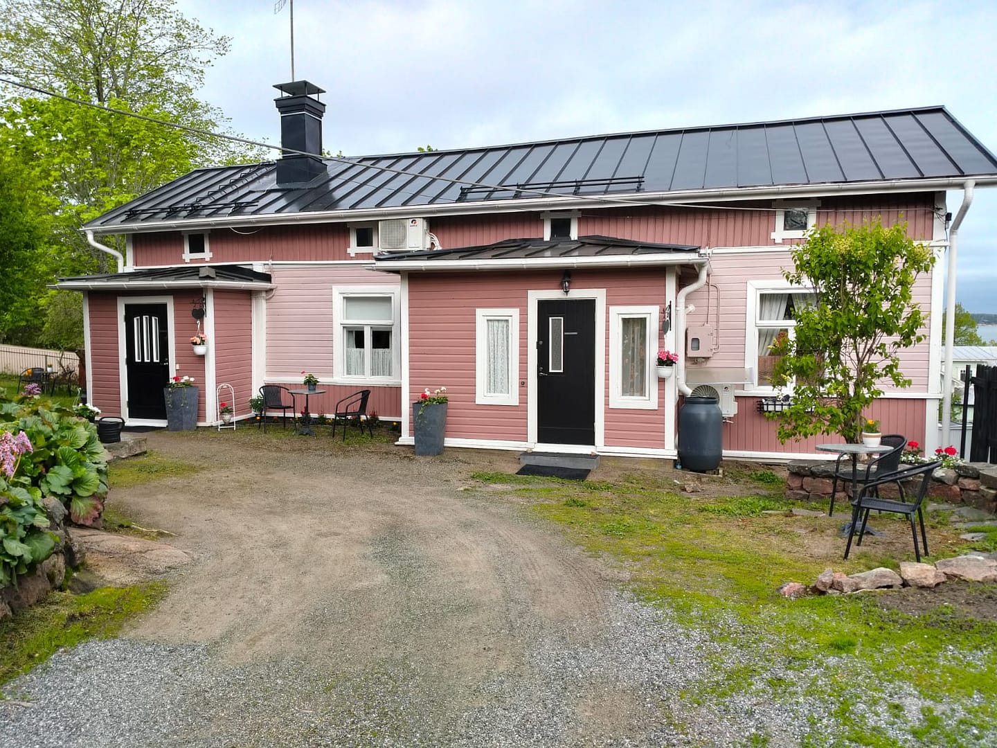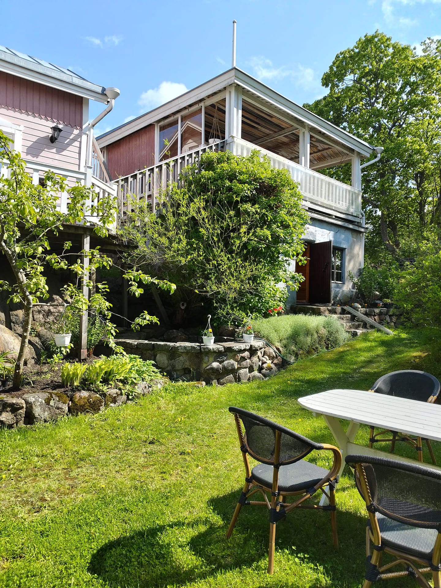 Rauhallinen, iso pihapiiri vanhoine istutuksineen ja kivetyksineen. Useita pöytäryhmiä. Voit istuskella pihalla lintujen laulua kuunnellen tai vaikka grillata ja nauttia Naantalin auringosta. Parkkipaikka löytyy.