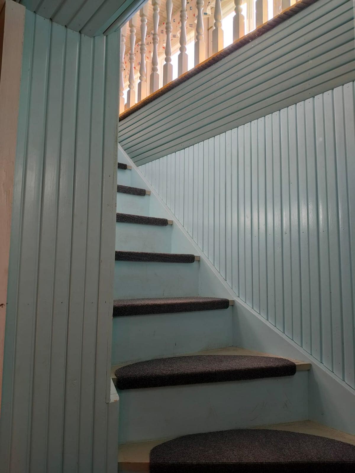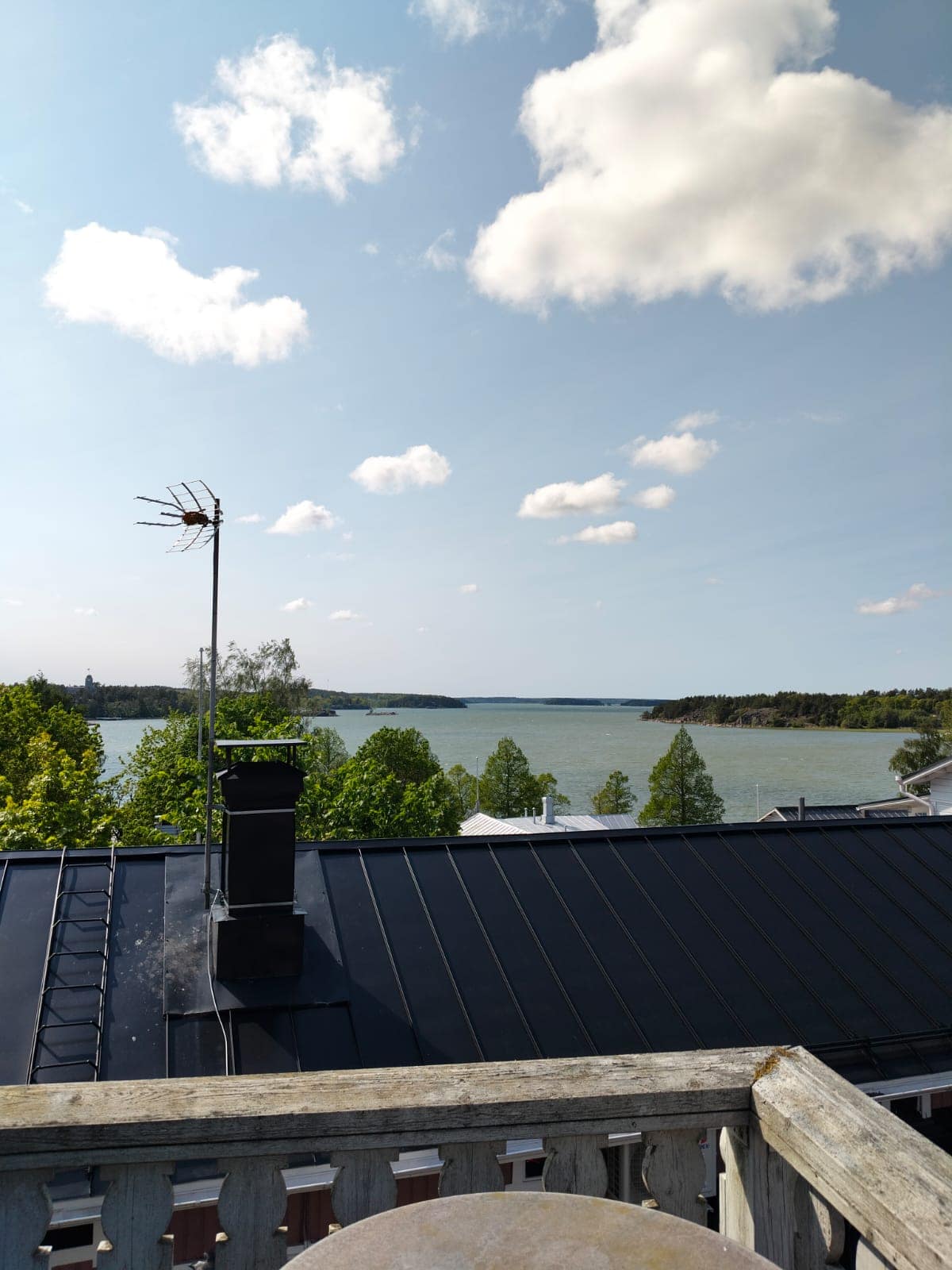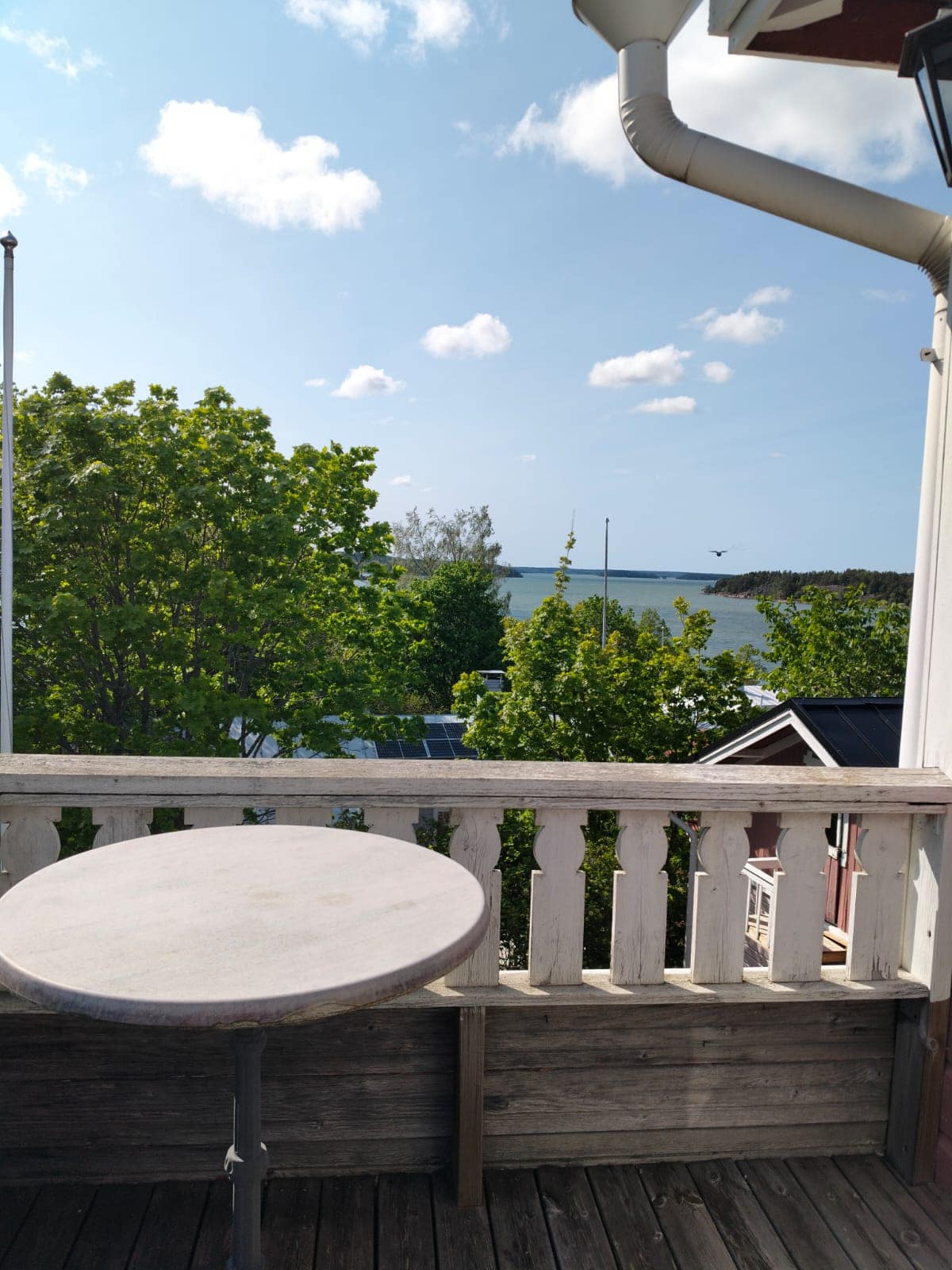 Nouset ylös portaita yläkertaan, jossa aukeaa upeat näkymät kauas merelle. Tästä huoneesta pääset myös kattoparvekkeille.