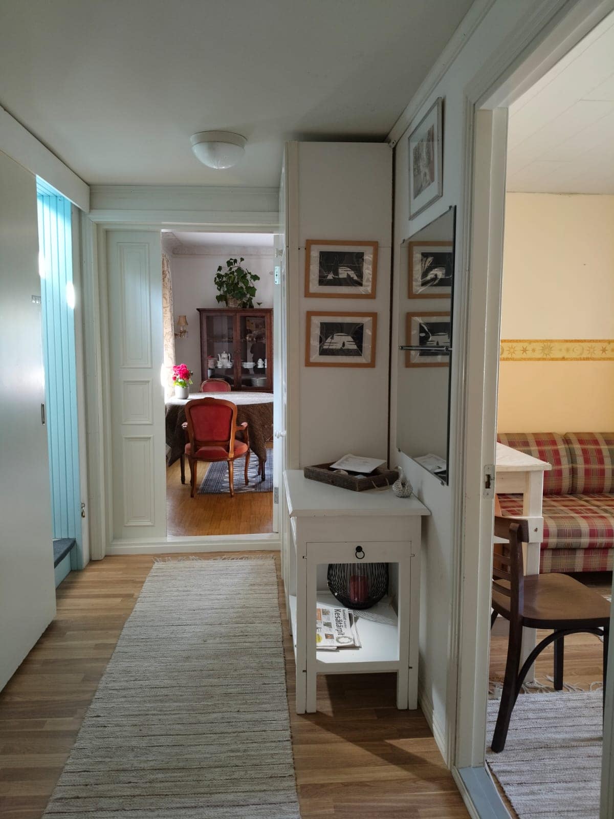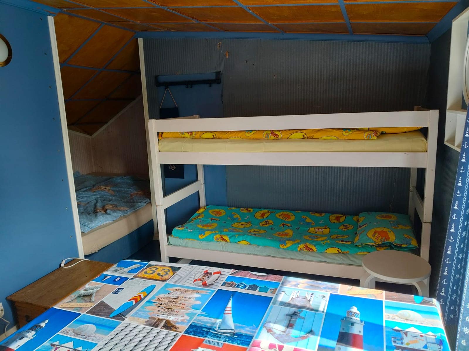 Toinen huone: Astioita, mikro, jääkaappi, kahvin- ja vedenkeitin. Parivuodealkovi, lasten kerrossänky ja vauvalle matkasänky.